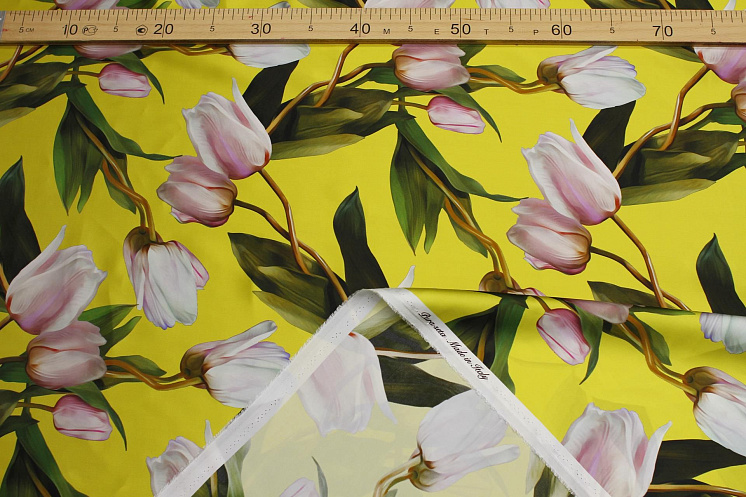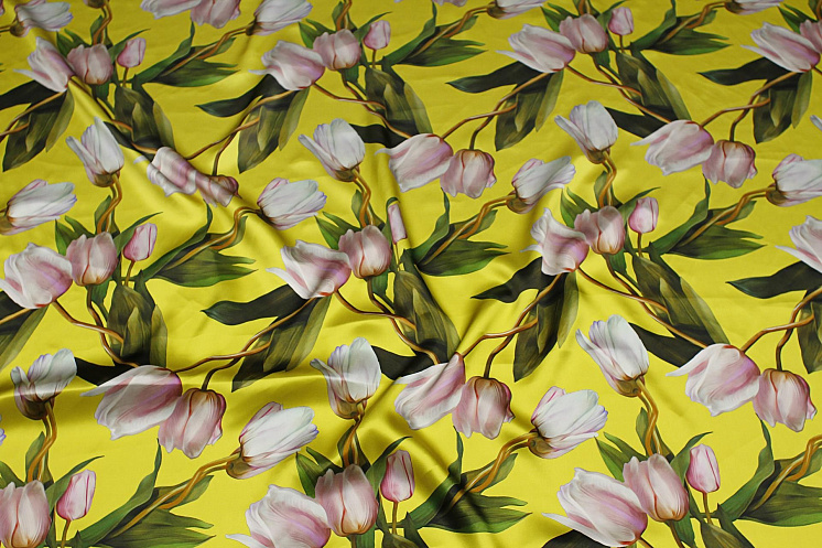 Шелк атлас (н) крупные тюльпаны на ярко-желтом - цена 7 200 ₽ У нас самые доступные цены на Шелк набивной в Москве, доставка по всей России - интернет магазин тканей Тессутидея. Артикул товара для заказа - 10-3698. Страна производства ткани – Италия. Ширина этого материала - 140. Состав - Шелк 100%. Наличие остатков на складе - 4.3 м