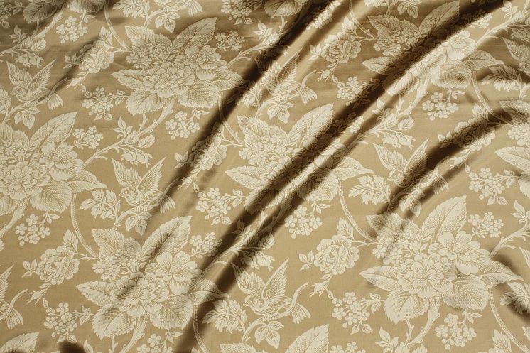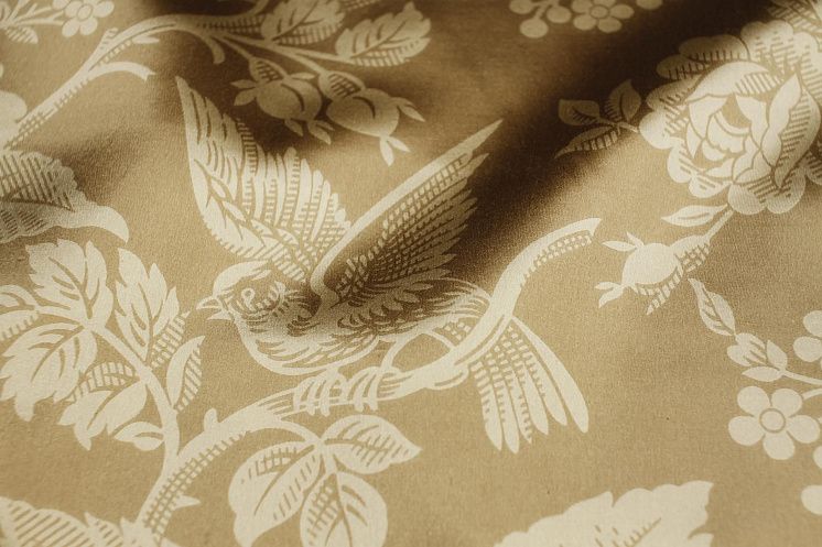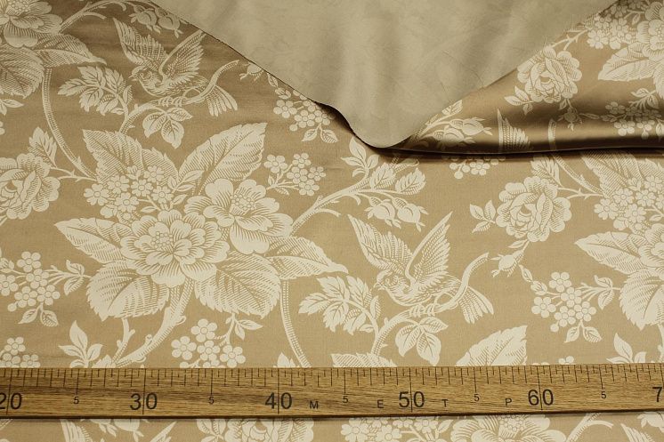 Шелк атлас (н) светло-бежевый растительный рисунок и птицы на бежевом Арт. 10-4644