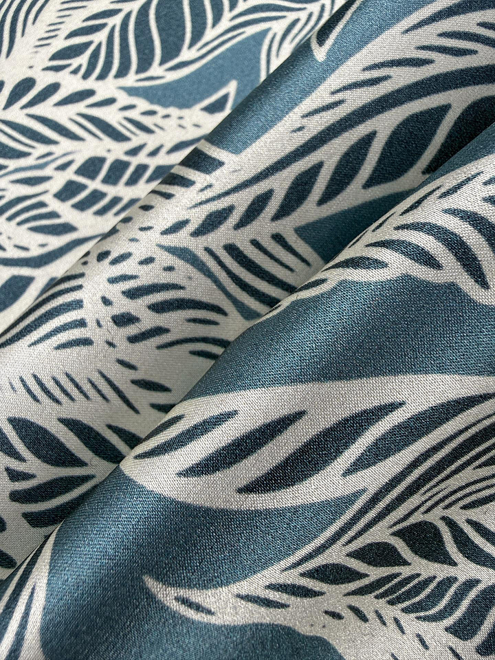 Шелк атлас стрейч (н) серо-синий рисунок на белом Арт. 10-5156
