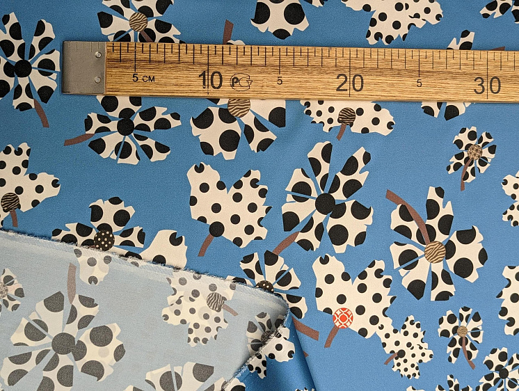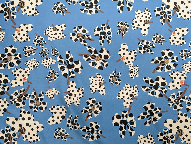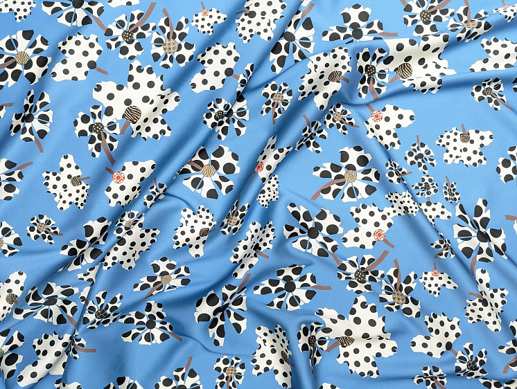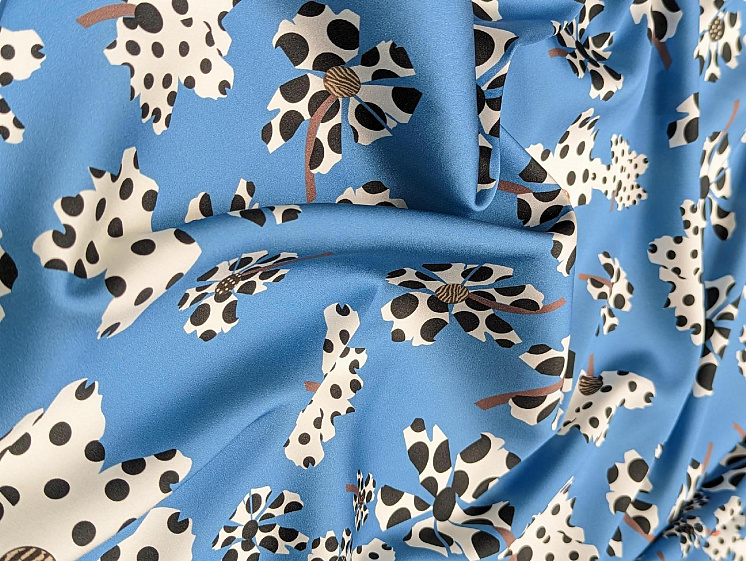 Шелк атлас стрейч (н) стилизованные цветы в горох на голубом - цена 5 800 ₽ У нас самые доступные цены на Шелк набивной в Москве, доставка по всей России - интернет магазин тканей Тессутидея. Артикул товара для заказа - 10-3050. Страна производства ткани – Италия. Ширина этого материала - 137. Состав - Шелк 96% эластан 4%. Наличие остатков на складе - 2.45 м