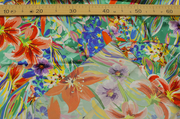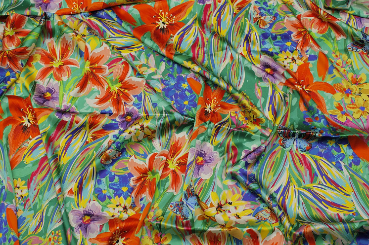 Шелк атлас стрейч (н) цветочный рисунок и бабочки на зеленом - цена 4 800 ₽ У нас самые доступные цены на Шелк набивной в Москве, доставка по всей России - интернет магазин тканей Тессутидея. Артикул товара для заказа - 10-3428. Страна производства ткани – Италия. Ширина этого материала - 140. Состав - Шелк 95% эластан 5%. Наличие остатков на складе - 2.3 м
