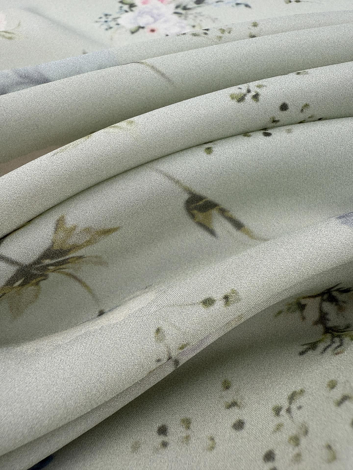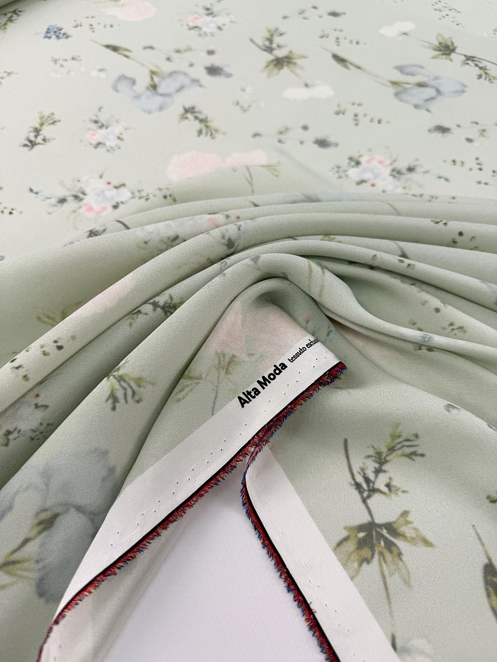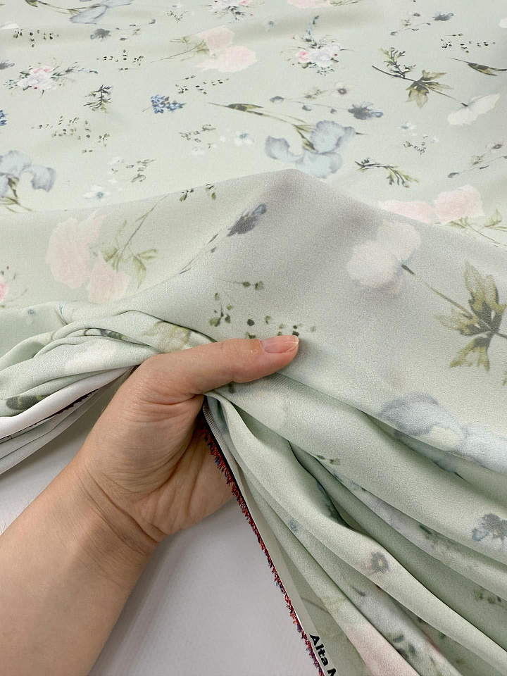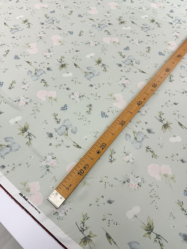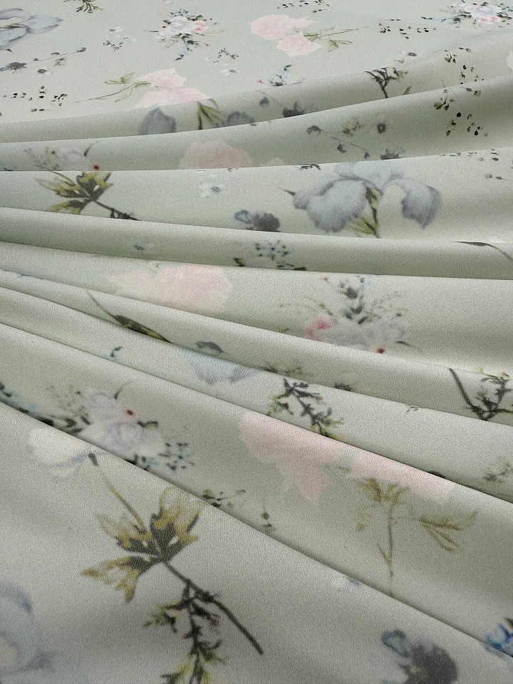 Шелк атлас стрейч (н) цветочный рисунок на светло-зеленом - цена 4 800 ₽ У нас самые доступные цены на в Москве, доставка по всей России - интернет магазин тканей Тессутидея. Артикул товара для заказа - 10-4737. Страна производства ткани – Италия. Ширина этого материала - 135. Состав - Шелк 95% эластан 5%. Наличие остатков на складе - 3.8 м