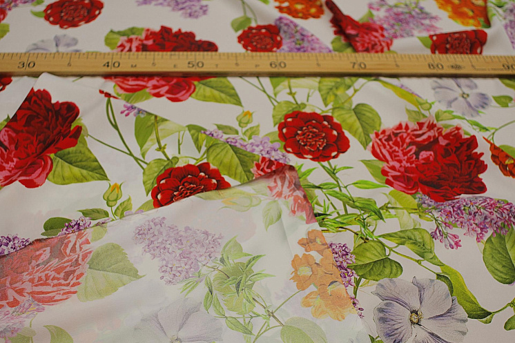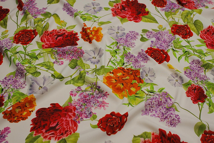 Шелк атлас стрейч (н) цветы и сирень на белом - цена 5 800 ₽ У нас самые доступные цены на в Москве, доставка по всей России - интернет магазин тканей Тессутидея. Артикул товара для заказа - 10-3276. Страна производства ткани – Италия. Ширина этого материала - 140. Состав - Шелк 97% эластан 3%. Наличие остатков на складе - 6.4 м