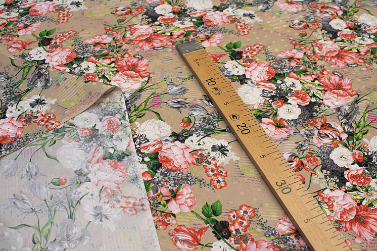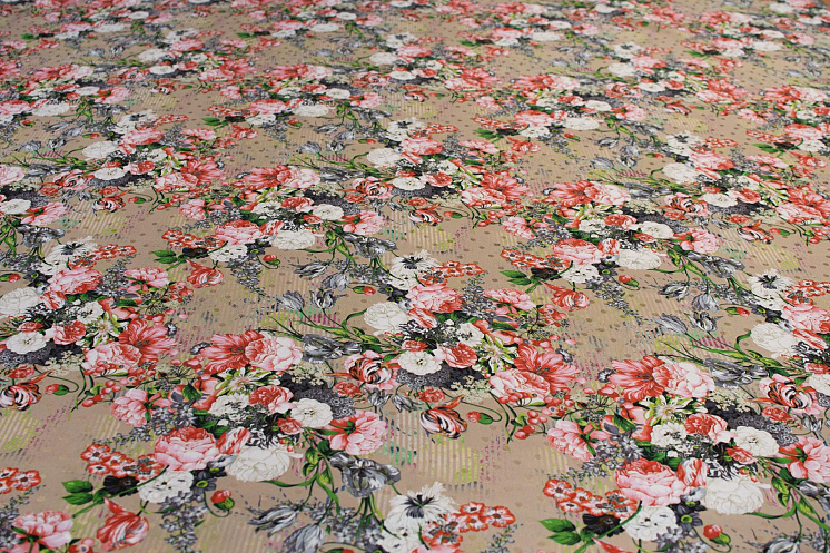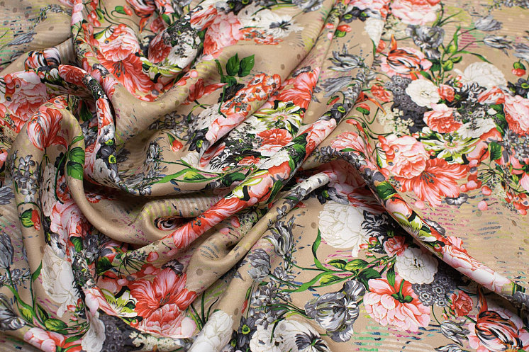 Шелк дама (н) цветочно-ягодный орнамент на бежевом в стиле Ungaro - цена 4 500 ₽ У нас самые доступные цены на Шелк набивной в Москве, доставка по всей России - интернет магазин тканей Тессутидея. Артикул товара для заказа - 10-0602. Страна производства ткани – Италия. Ширина этого материала - 140. Состав - Шелк 100%. Наличие остатков на складе - 1.7 м