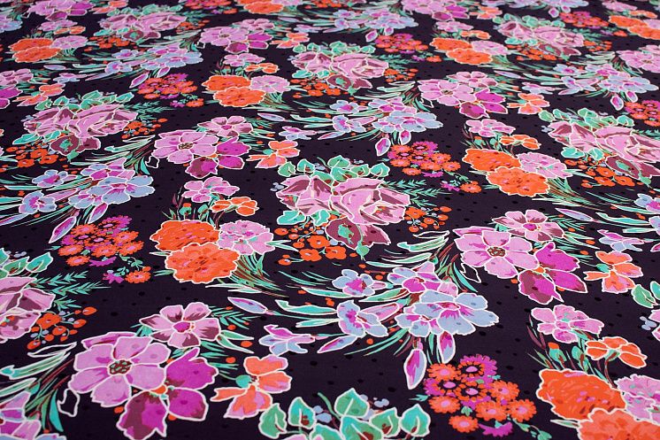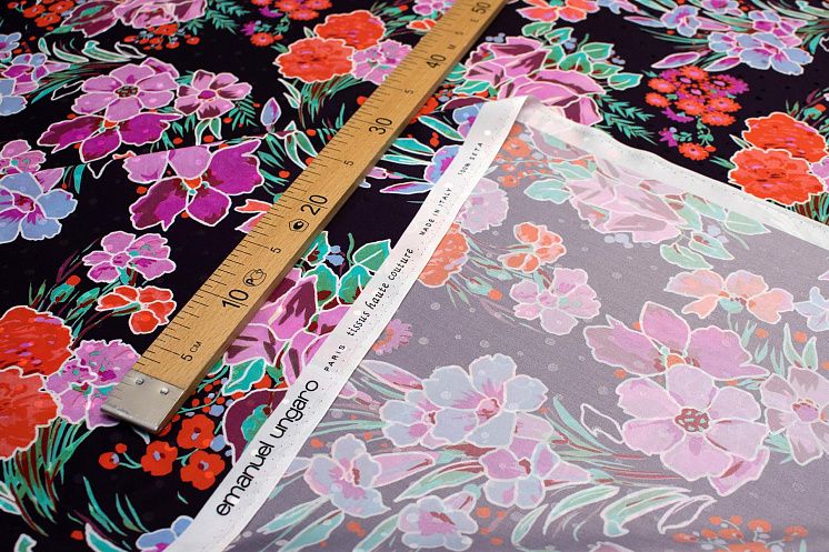 Шелк дама (н) цветочный орнамент на баклажановом в стиле Ungaro - цена 4 500 ₽ У нас самые доступные цены на Шелк набивной в Москве, доставка по всей России - интернет магазин тканей Тессутидея. Артикул товара для заказа - 10-0605. Страна производства ткани – Италия. Ширина этого материала - 140. Состав - Шелк 100%. Наличие остатков на складе - 2.3 м