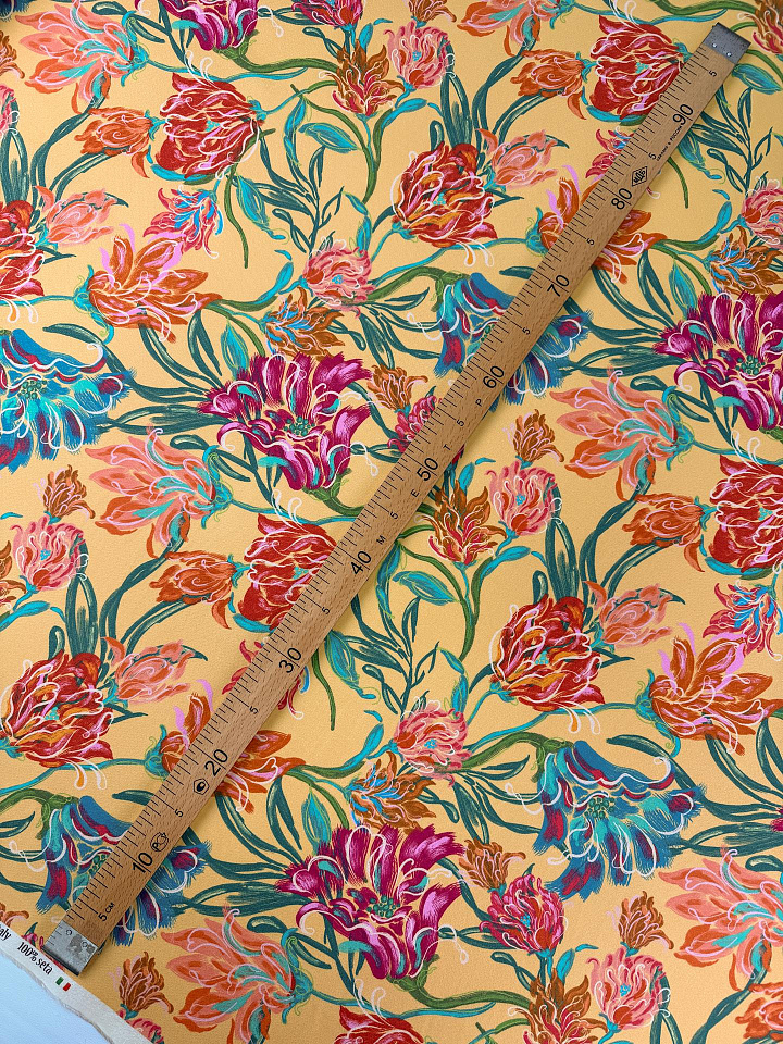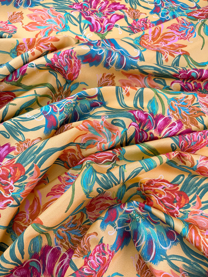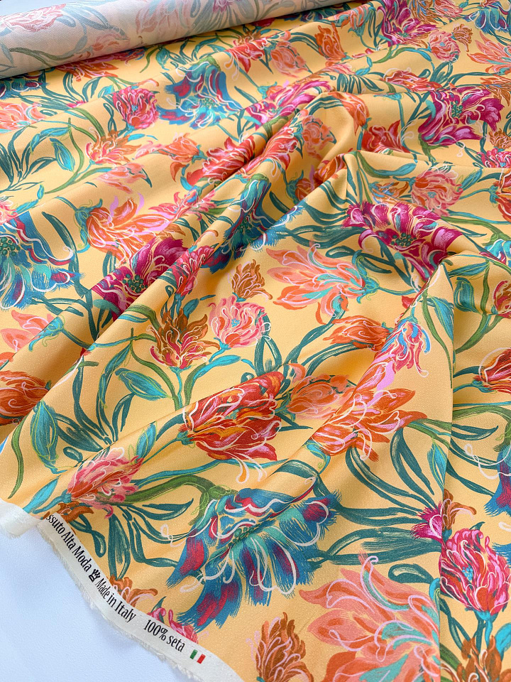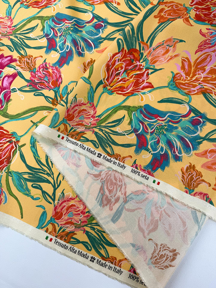 Шелк фактурный (н) яркий цветочный рисунок на желтом - цена 6 800 ₽ У нас самые доступные цены на в Москве, доставка по всей России - интернет магазин тканей Тессутидея. Артикул товара для заказа - 10-5157. Страна производства ткани – Италия. Ширина этого материала - 140. Состав - Шелк 100%. Наличие остатков на складе - 12.4 м
