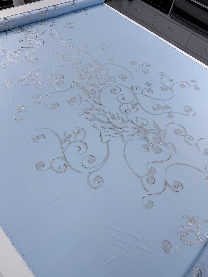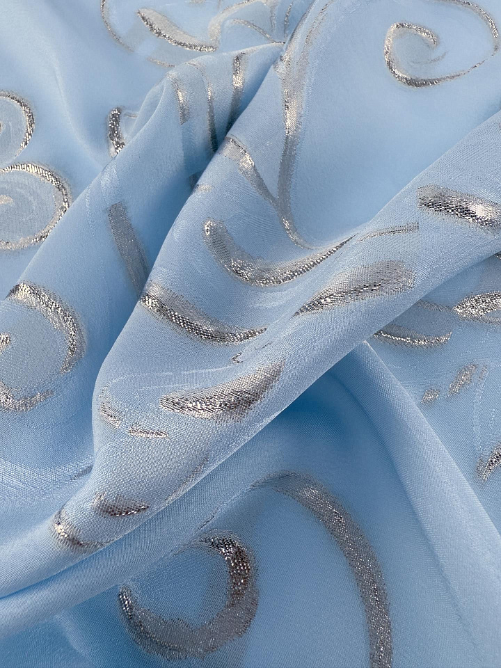 Шелк филькупе с люрексом (н) серебряный растительный рисунок на голубом Арт. 10-4727