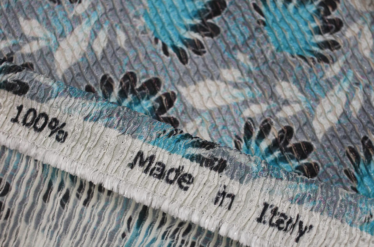 Шелк плиссе с люрексом (н) бирюзовый рисунок на сером - цена 4 500 ₽ У нас самые доступные цены на Шелк набивной в Москве, доставка по всей России - интернет магазин тканей Тессутидея. Артикул товара для заказа - 10-4129. Страна производства ткани – Италия. Ширина этого материала - 140. Состав - Шелк 100%. Наличие остатков на складе - 2.5 м