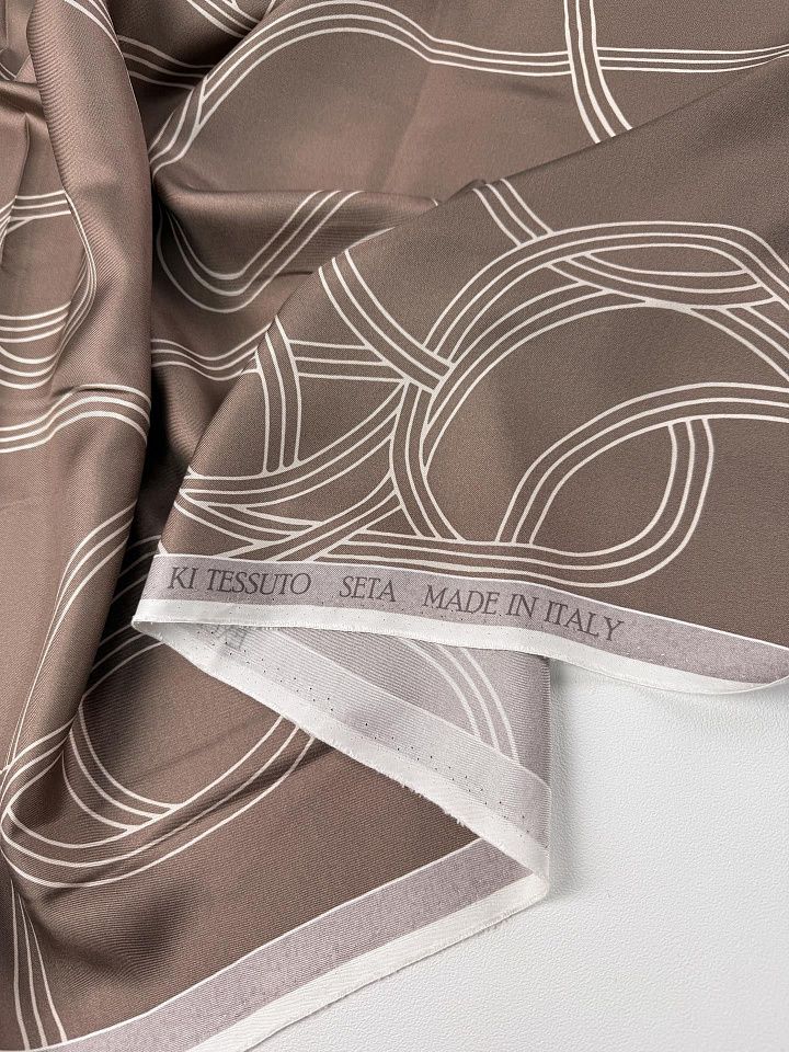 Шелк твил (н) белая геометрическая абстракция на светло-коричневом - цена 6 500 ₽ У нас самые доступные цены на в Москве, доставка по всей России - интернет магазин тканей Тессутидея. Артикул товара для заказа - 10-4872. Страна производства ткани – Италия. Ширина этого материала - 140. Состав - Шелк 100%. Наличие остатков на складе - 5.6 м