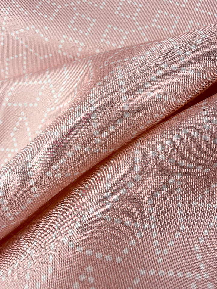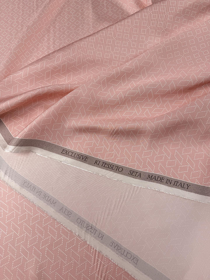 Шелк твил (н) белый геометрический рисунок на светло-розовом - цена 6 500 ₽ У нас самые доступные цены на в Москве, доставка по всей России - интернет магазин тканей Тессутидея. Артикул товара для заказа - 10-5111. Страна производства ткани – Италия. Ширина этого материала - 140. Состав - Шелк 100%. Наличие остатков на складе - 11.6 м