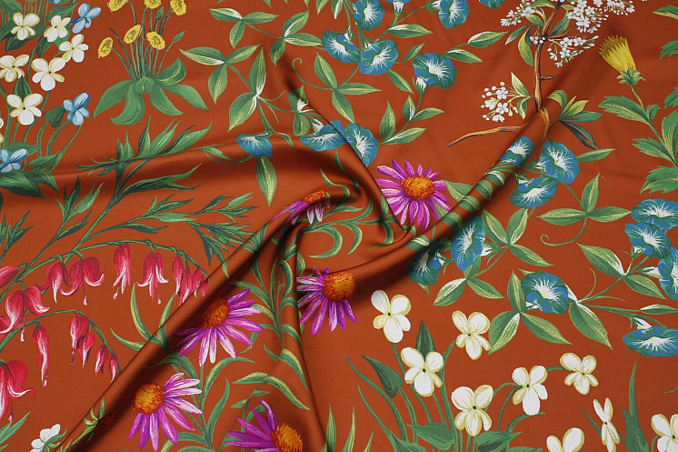 Шелк твил (н) ягодно-растительный рисунок на терракотовом - цена 7 200 ₽ У нас самые доступные цены на Шелк набивной в Москве, доставка по всей России - интернет магазин тканей Тессутидея. Артикул товара для заказа - 10-4220. Страна производства ткани – Италия. Ширина этого материала - 140. Состав - Шелк 100%. Наличие остатков на складе - 7.8 м