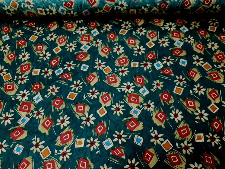 Шелк жаккард (н) красно-бежево-голубой орнамент на темно-зеленом Арт. 02-6776