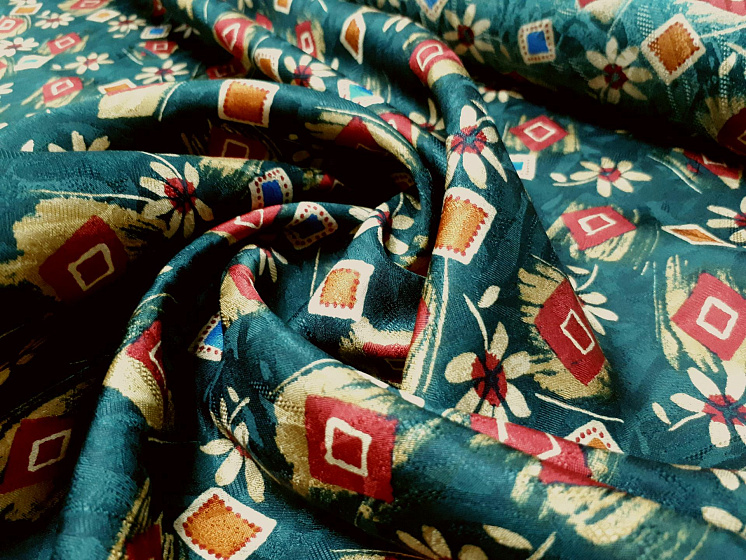 Шелк жаккард (н) красно-бежево-голубой орнамент на темно-зеленом - цена 2 300 ₽ У нас самые доступные цены на Шелк набивной в Москве, доставка по всей России - интернет магазин тканей Тессутидея. Артикул товара для заказа - 02-6776. Страна производства ткани – Италия. Ширина этого материала - 140. Состав - Шелк 100%. Наличие остатков на складе - 1.4 м