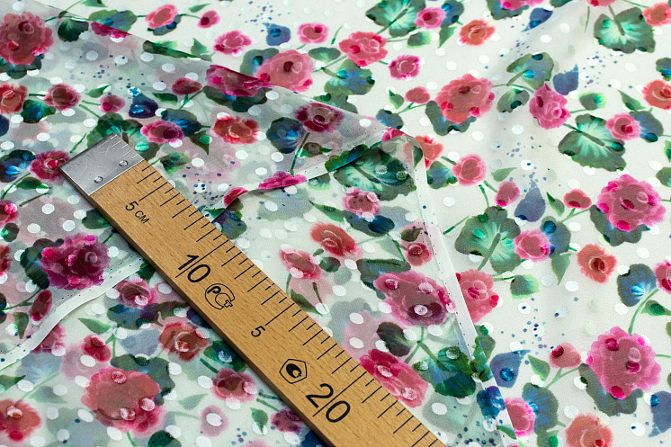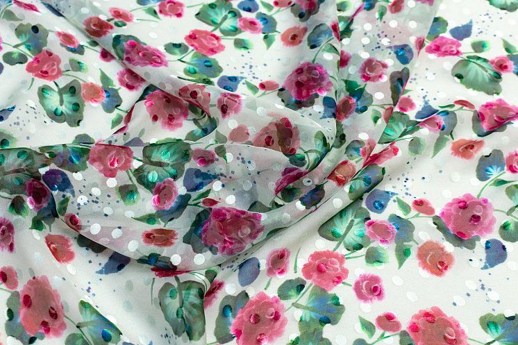 Шифон дама(н) цветочный орнамент и горох на белом - цена 4 200 ₽ У нас самые доступные цены на Шифон в Москве, доставка по всей России - интернет магазин тканей Тессутидея. Артикул товара для заказа - 02-8763. Страна производства ткани – Италия. Ширина этого материала - 140. Состав - Шелк 100%. Наличие остатков на складе - 2.6 м