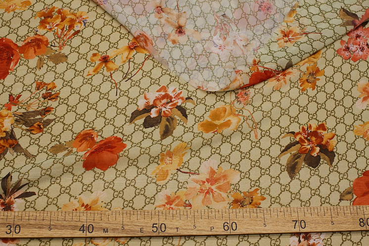 Шифон (н) бежево-оранжевый цветочный рисунок и логотип на оливковом меланже - цена 6 800 ₽ У нас самые доступные цены на Шифон в Москве, доставка по всей России - интернет магазин тканей Тессутидея. Артикул товара для заказа - 10-3969. Страна производства ткани – Италия. Ширина этого материала - 135. Состав - Шелк 100%. Наличие остатков на складе - 3.3 м
