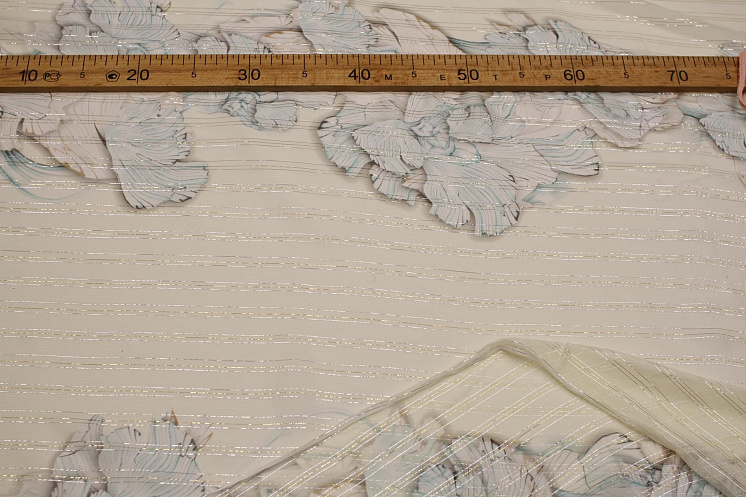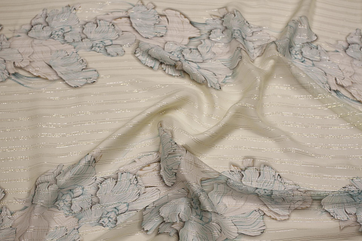 Шифон (н) бирюзовый цветочный рисунок и полоски из люрекса на светло-бежевом - цена 4 200 ₽ У нас самые доступные цены на Шифон в Москве, доставка по всей России - интернет магазин тканей Тессутидея. Артикул товара для заказа - 10-4619. Страна производства ткани – Италия. Ширина этого материала - 140. Состав - Шелк 90% люрекс 10%. Наличие остатков на складе - 2.3 м