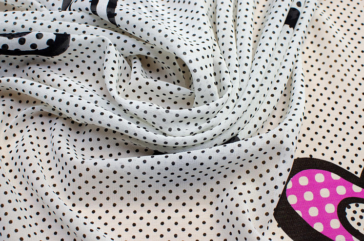 Шифон (н) черный горох и сердца на белом в стиле Moschino - цена 3 200 ₽ У нас самые доступные цены на Шифон в Москве, доставка по всей России - интернет магазин тканей Тессутидея. Артикул товара для заказа - 02-8717. Страна производства ткани – Италия. Ширина этого материала - 140. Состав - Шелк 100%. Наличие остатков на складе - 1.9 м