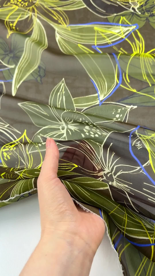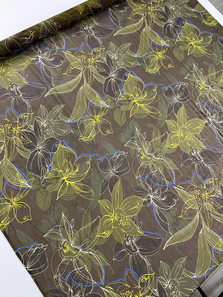 Шифон (н) крупный цветочный рисунок на хаки - цена 4 200 ₽ У нас самые доступные цены на в Москве, доставка по всей России - интернет магазин тканей Тессутидея. Артикул товара для заказа - 10-5020. Страна производства ткани – Италия. Ширина этого материала - 135. Состав - Шелк 100%. Наличие остатков на складе - 9.9 м