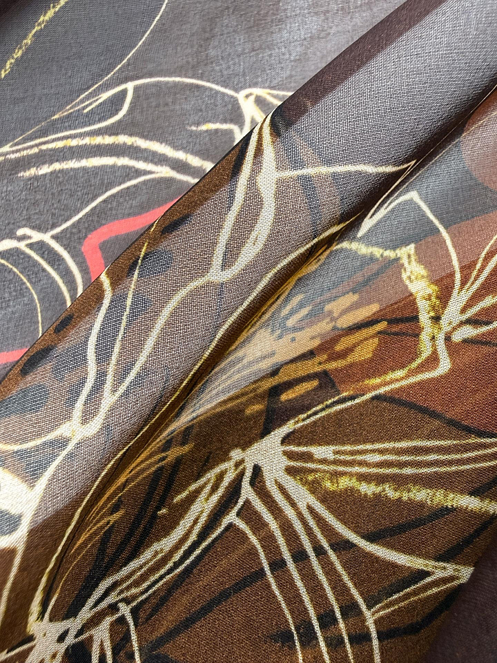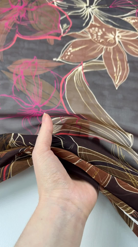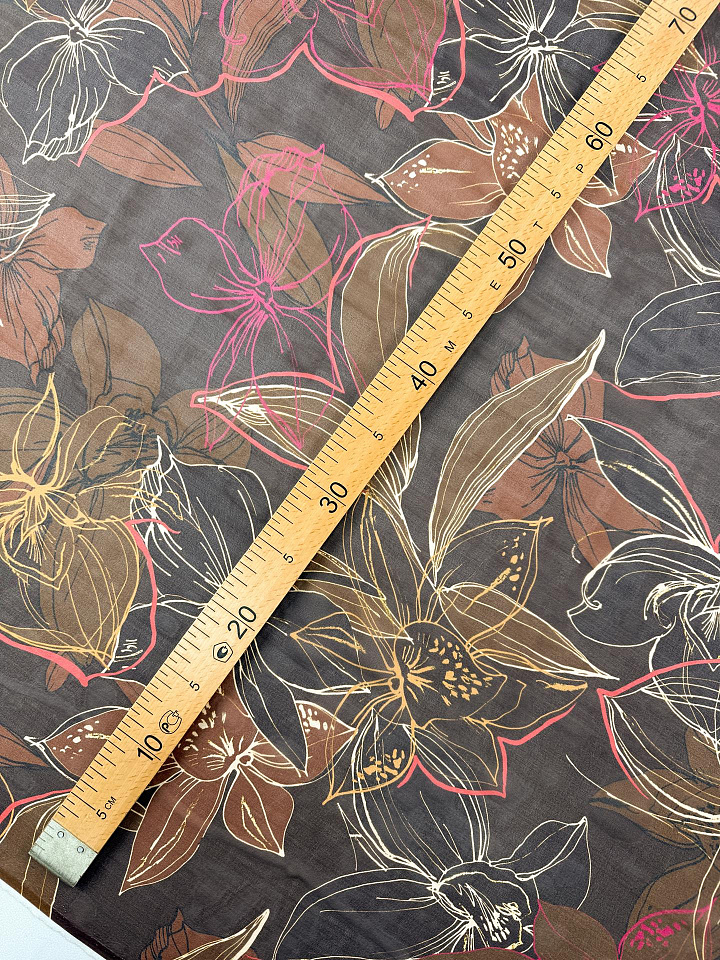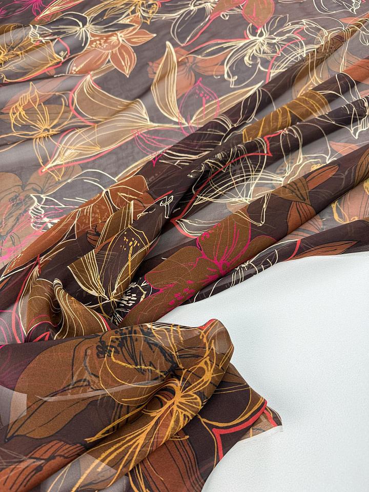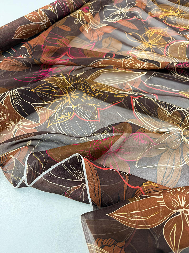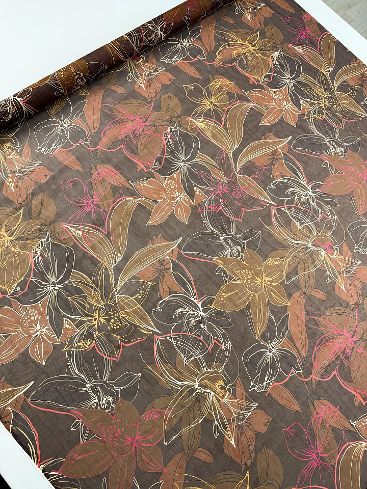 Шифон (н) крупный цветочный рисунок на темно-коричневом - цена 4 200 ₽ У нас самые доступные цены на в Москве, доставка по всей России - интернет магазин тканей Тессутидея. Артикул товара для заказа - 10-5019. Страна производства ткани – Италия. Ширина этого материала - 130. Состав - Шелк 100%. Наличие остатков на складе - 7.8 м