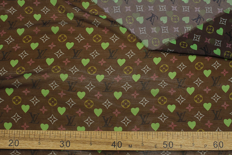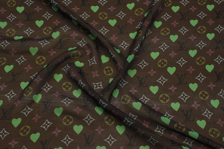 Шифон (н) салатовые сердца и логотип на темно-коричневом - цена 6 800 ₽ У нас самые доступные цены на Шифон в Москве, доставка по всей России - интернет магазин тканей Тессутидея. Артикул товара для заказа - 10-3959. Страна производства ткани – Италия. Ширина этого материала - 135. Состав - Шелк 100%. Наличие остатков на складе - 2.1 м
