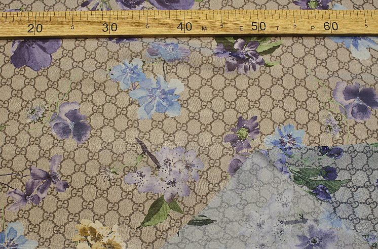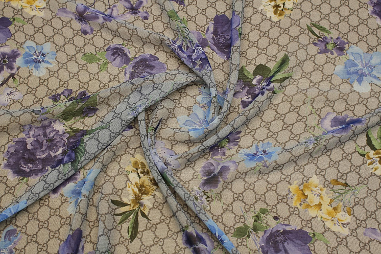 Шифон (н) желто-бежевый цветочный рисунок и логотип на голубом меланже - цена 6 800 ₽ У нас самые доступные цены на Шифон в Москве, доставка по всей России - интернет магазин тканей Тессутидея. Артикул товара для заказа - 10-3966. Страна производства ткани – Италия. Ширина этого материала - 135. Состав - Шелк 100%. Наличие остатков на складе - 2.55 м