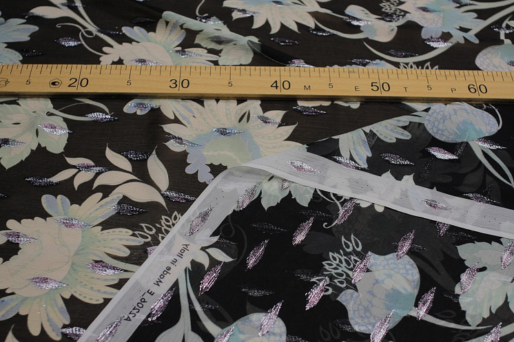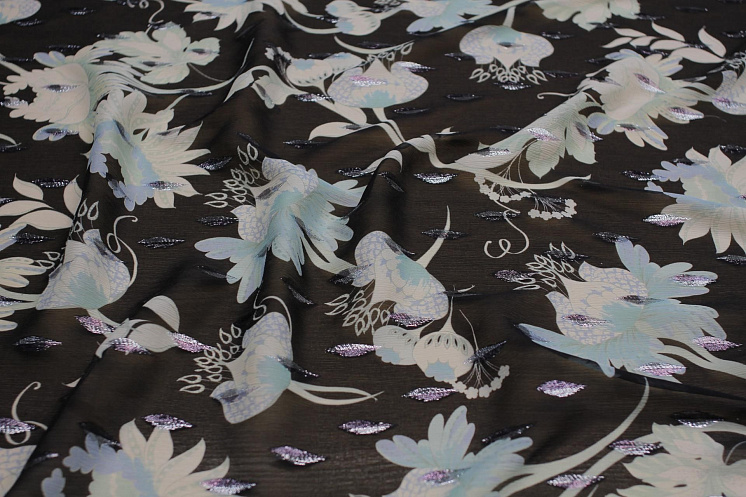 Шифон с люрексом (н) бело-мятно-голубой цветочный рисунок на черном - цена 5 800 ₽ У нас самые доступные цены на Шифон в Москве, доставка по всей России - интернет магазин тканей Тессутидея. Артикул товара для заказа - 10-3280. Страна производства ткани – Италия. Ширина этого материала - 125. Состав - Шелк 90% люрекс 10%. Наличие остатков на складе - 2 м