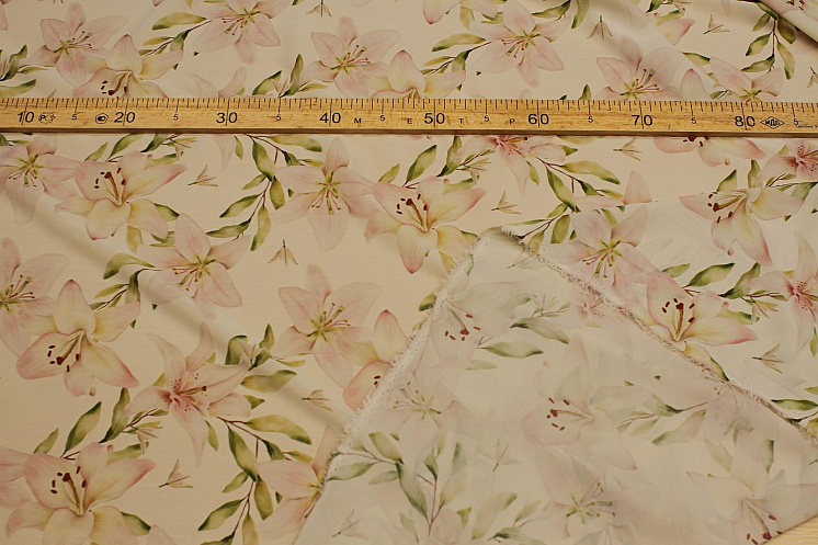 Шифон стрейч (н) лилии на бежевом - цена 3 400 ₽ У нас самые доступные цены на Шифон в Москве, доставка по всей России - интернет магазин тканей Тессутидея. Артикул товара для заказа - 10-3337. Страна производства ткани – Италия. Ширина этого материала - 140. Состав - Шелк 97% эластан 3%. Наличие остатков на складе - 1.5 м