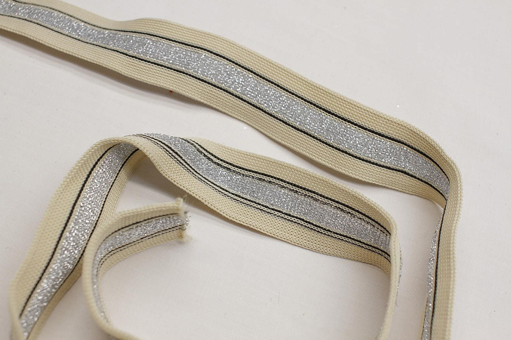 Тесьма лампас трикотажная с люрексом (н) бежево-серебрянная ш-2,5см - цена 400 ₽ У нас самые доступные цены на в Москве, доставка по всей России - интернет магазин тканей Тессутидея. Артикул товара для заказа - F-6198. Страна производства ткани – Италия. Ширина этого материала - 2.5. Состав - . Наличие остатков на складе - 59.1 м