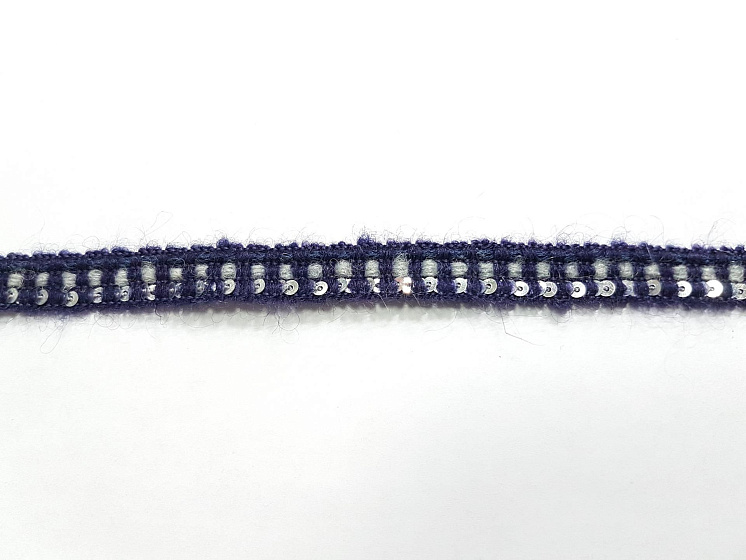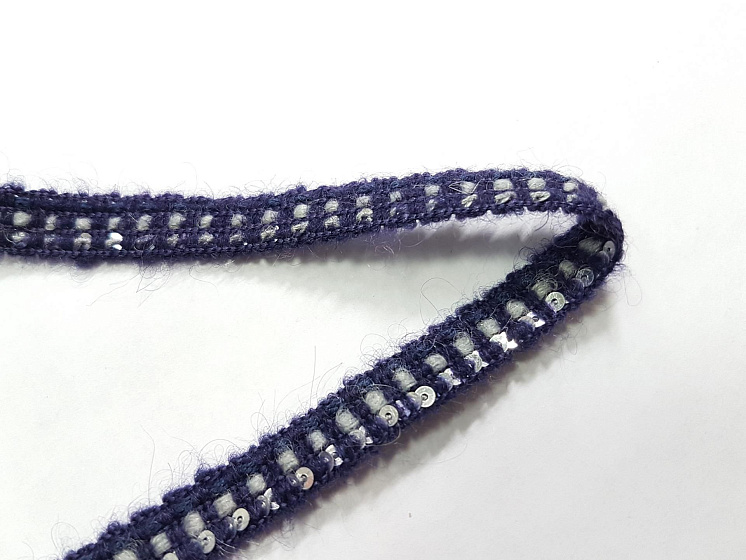 Тесьма шанель с пайетками сине-серая ш-1см - цена 450 ₽ У нас самые доступные цены на в Москве, доставка по всей России - интернет магазин тканей Тессутидея. Артикул товара для заказа - F-5185. Страна производства ткани – Италия. Ширина этого материала - 1. Состав - Шерсть, акрил, полиэстер. Наличие остатков на складе - 8 м