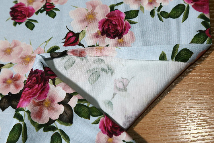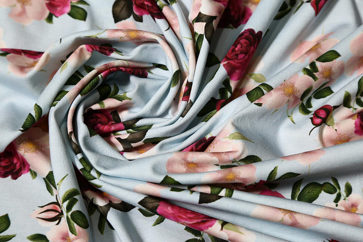 Трикотаж (н) цветочный орнамент на светло-голубом - цена 1 800 ₽ У нас самые доступные цены на в Москве, доставка по всей России - интернет магазин тканей Тессутидея. Артикул товара для заказа - 12-0675. Страна производства ткани – Италия. Ширина этого материала - 160. Состав - Хлопок 94% эластан 6%. Наличие остатков на складе - 4.7 м