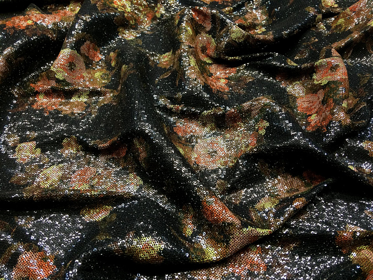 Трикотаж с пайетками (н) оранжево-зеленыйцветочный орнамент на черном Арт. 13-1299
