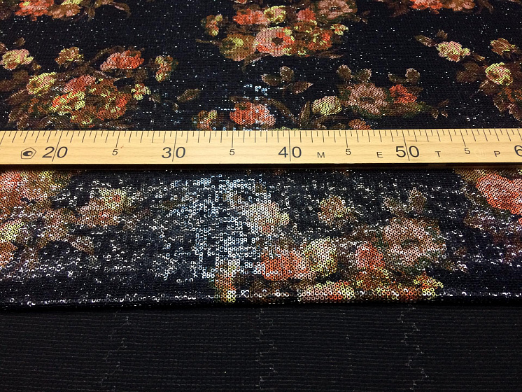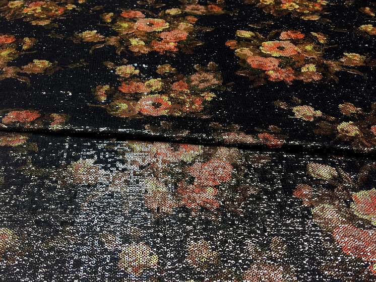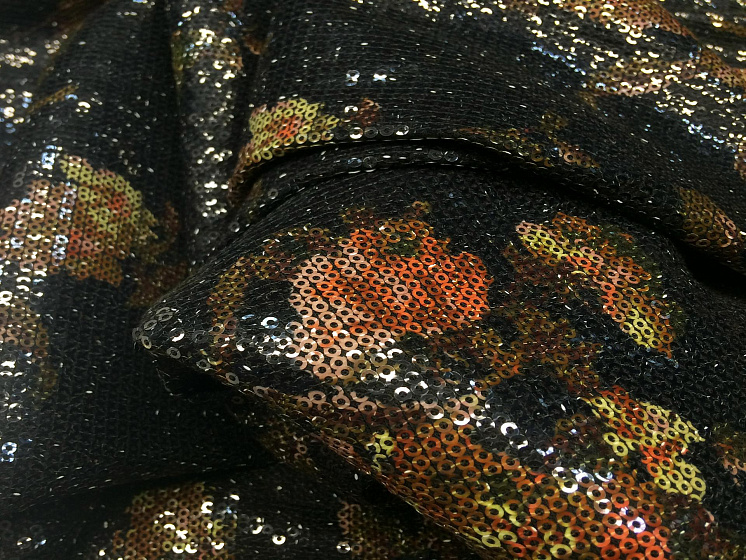 Трикотаж с пайетками (н) оранжево-зеленыйцветочный орнамент на черном - цена 3 500 ₽ У нас самые доступные цены на в Москве, доставка по всей России - интернет магазин тканей Тессутидея. Артикул товара для заказа - 13-1299. Страна производства ткани – Италия. Ширина этого материала - 140. Состав - Вискоза 50% полиэстер 45% эластан 5%. Наличие остатков на складе - 1.4 м