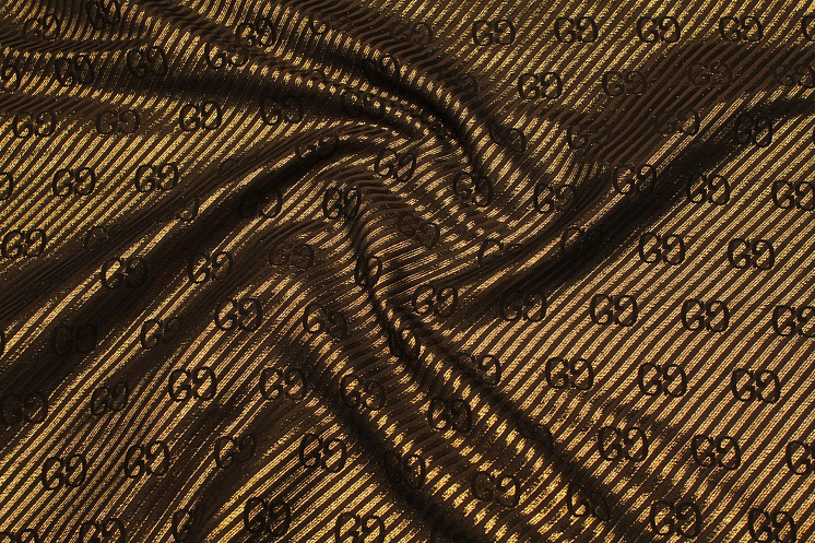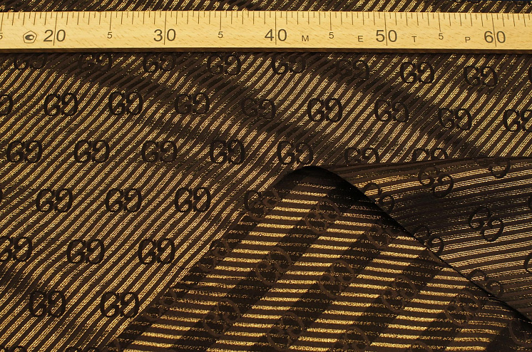 Жаккард с люрексом (н) логотип на коричнево-золотой полоске - цена 7 500 ₽ У нас самые доступные цены на в Москве, доставка по всей России - интернет магазин тканей Тессутидея. Артикул товара для заказа - 03-7340. Страна производства ткани – Италия. Ширина этого материала - 145. Состав - Шелк 30% хлопок 40% люрекс 30%. Наличие остатков на складе - 7.1 м