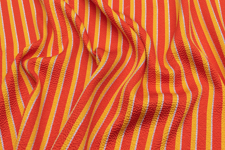 Жаккард с люрексом (н) оранжево-желтая полоска - цена 3 200 ₽ У нас самые доступные цены на Жаккард в Москве, доставка по всей России - интернет магазин тканей Тессутидея. Артикул товара для заказа - 03-6826. Страна производства ткани – Италия. Ширина этого материала - 130. Состав - Шелк 40% полиамид 40% люрекс 20%. Наличие остатков на складе - 3.7 м